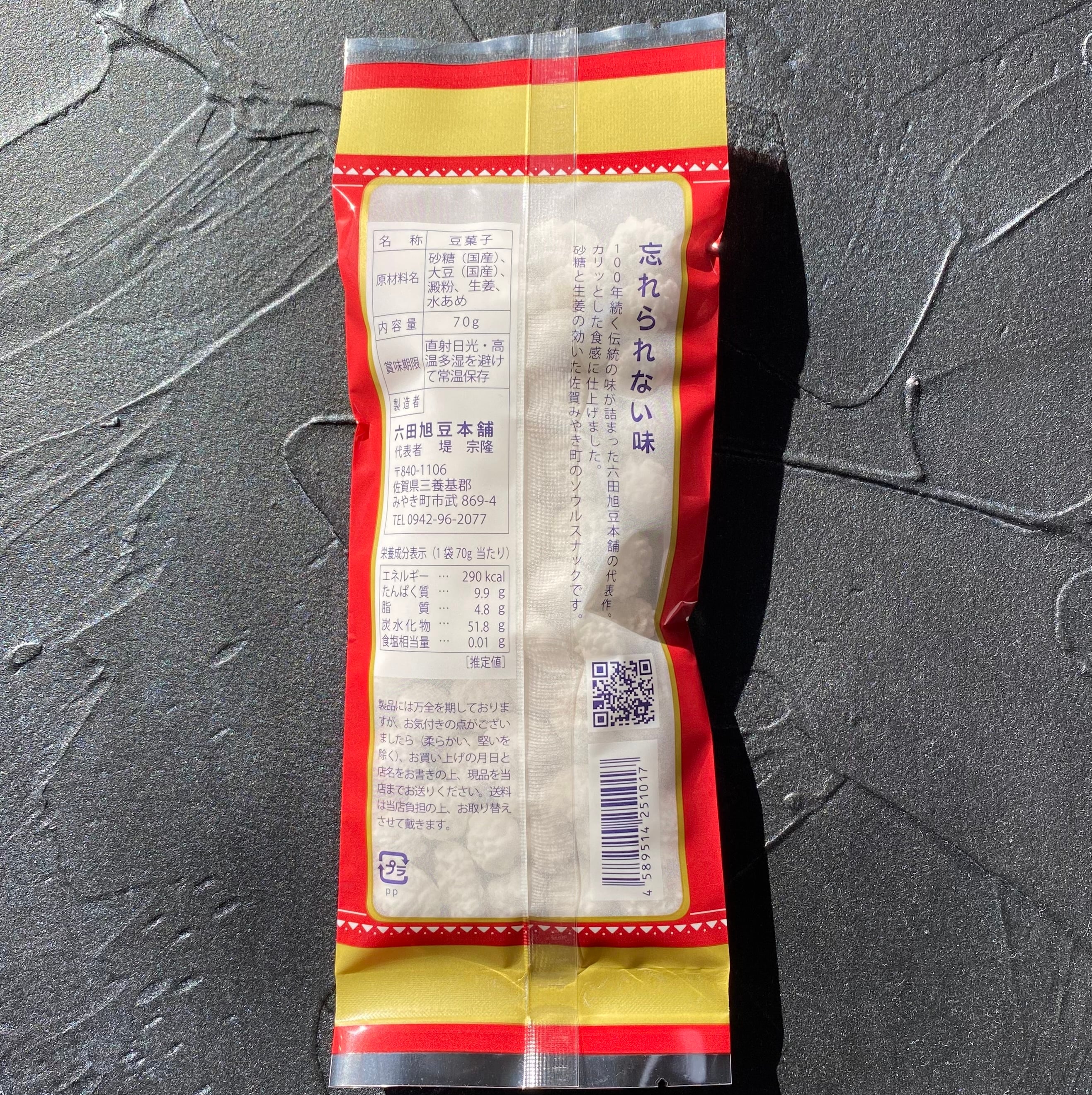 111年目を節に、えんどう豆から大豆に豆を変更し、更に美味しくなりました。六田旭豆本舗の代表作です。カリッとした食感に、中の豆はサクッと仕上げました。ほんのり生姜の味と大豆の美味しさをご堪能ください。佐賀みやき町のソウルスナックです!